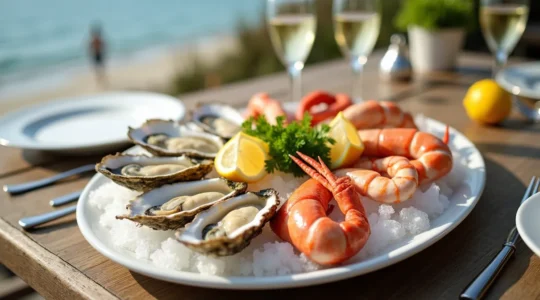 Brittany’s plateaux de fruits de mer (seafood platters) represent the region’s identity: oysters, clams, whelks, spider crab, langoustines, and shrimp arranged on crushed ice with shallot vinegar and rye bread. The experience is inseparable from its coastal setting—the same platter served inland loses cultural resonance. Look for restaurants with visible holding tanks and menus stating “our oysters” rather than generic “fresh oysters,” indicating direct sourcing from specific beds.